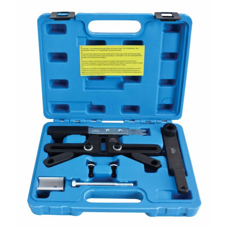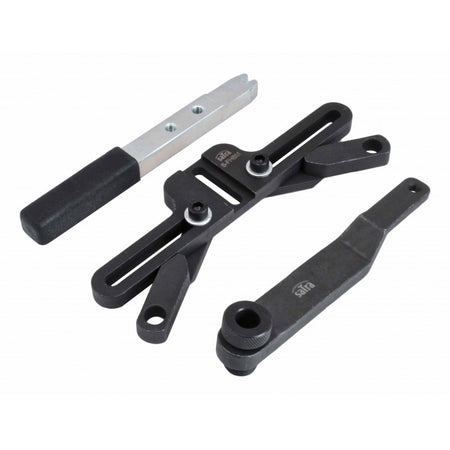 Ein speziell entwickeltes Werkzeug zur Arretierung des Schwungrads. Es wird benötigt, wenn die zentrale Schraube des Schwingungsdämpfers gelöst oder festgezogen werden muss, oder wenn die Steuerkette ausgebaut werden soll.