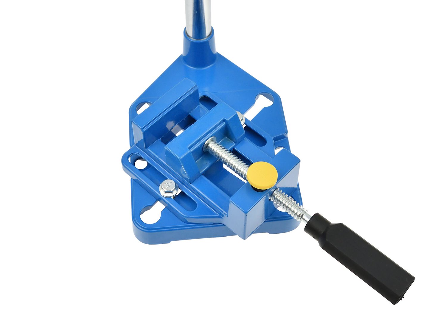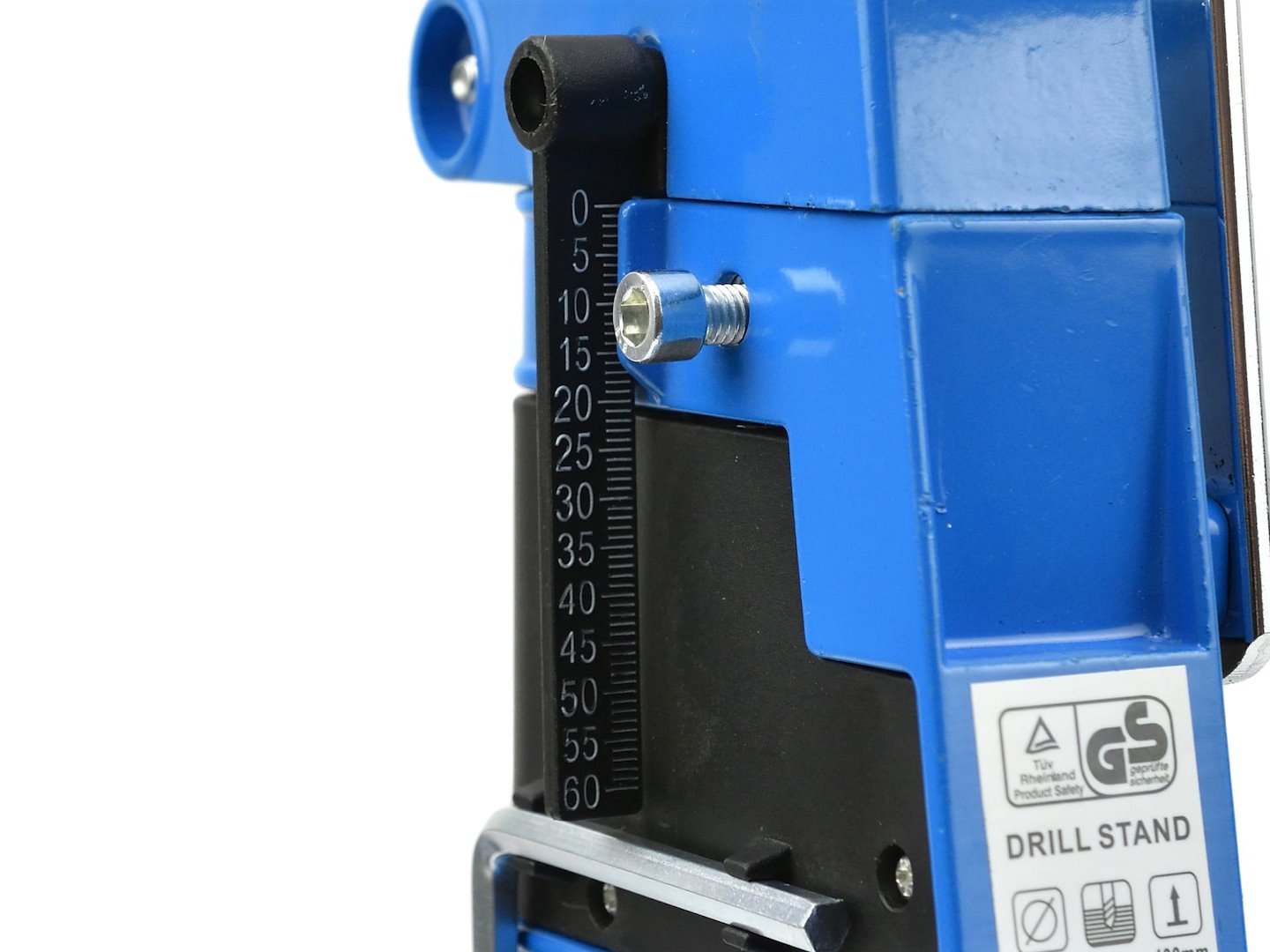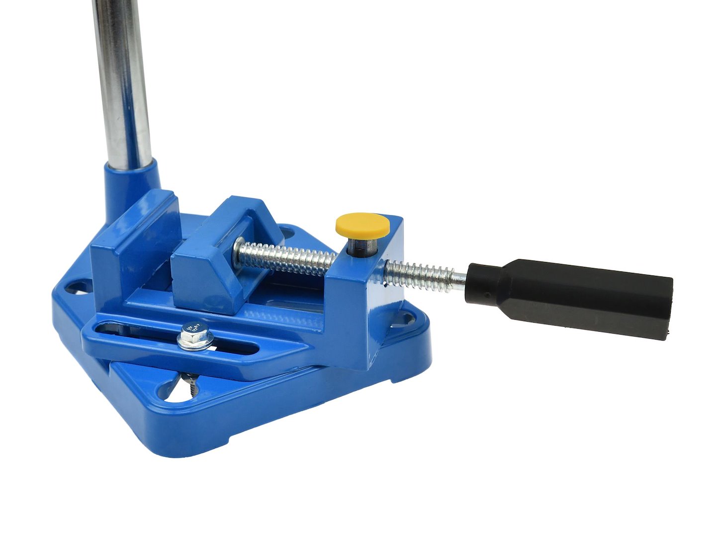 Bohrständer mit Schraubstock. Die leichte und stabile Konstruktion sowie der komfortable Stativ-Bedienhebel sorgen für Präzision beim Bohren. Durch die Verwendung einer universellen Bohrmaschinenaufnahme (Euronorm 0 43mm) kann nahezu jede Bohrmaschine auf dem Ständer montiert werden.