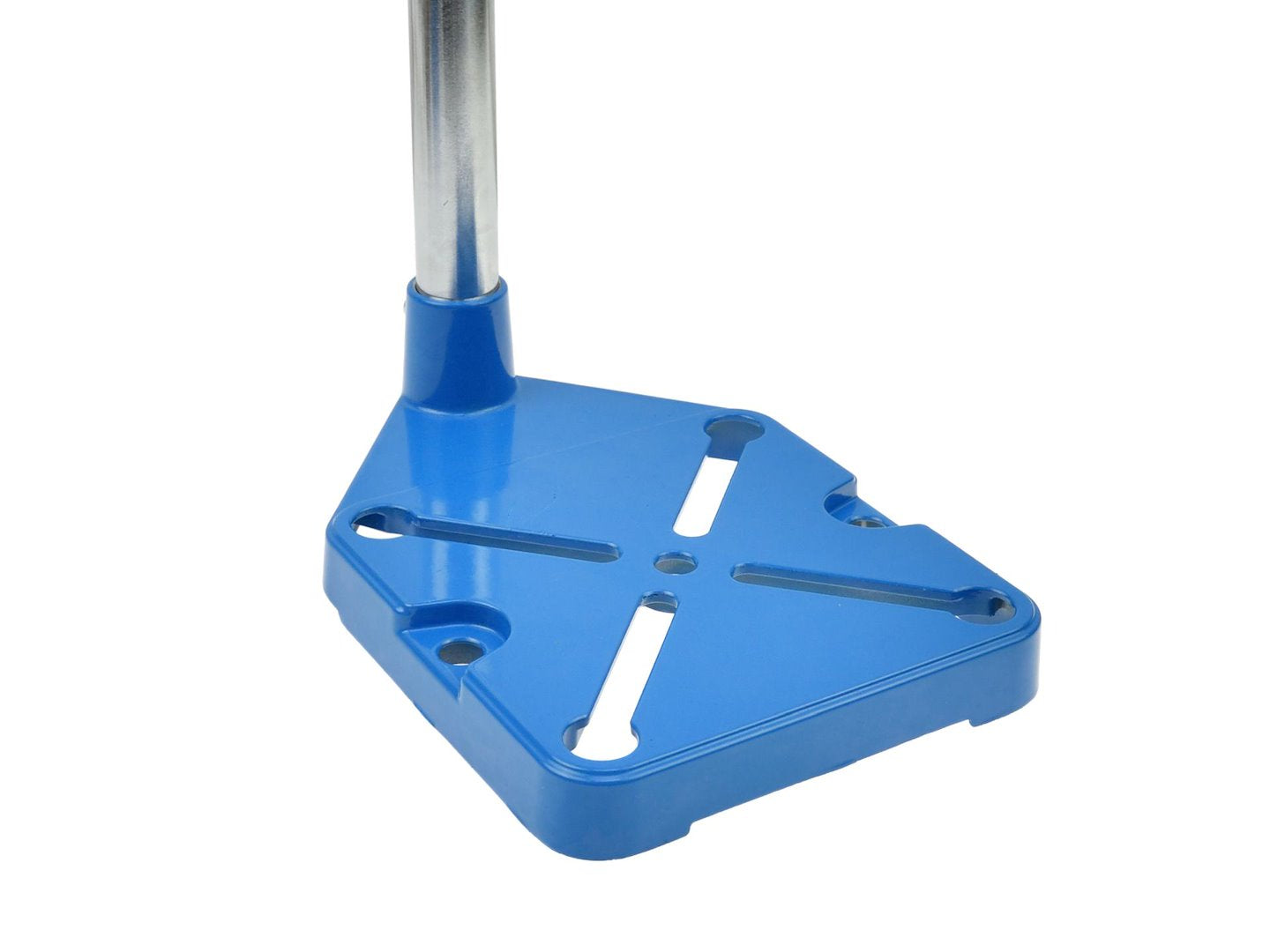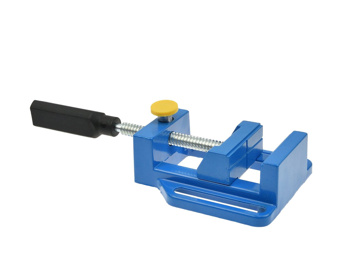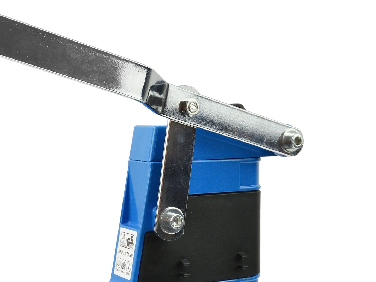 Bohrständer mit Schraubstock. Die leichte und stabile Konstruktion sowie der komfortable Stativ-Bedienhebel sorgen für Präzision beim Bohren. Durch die Verwendung einer universellen Bohrmaschinenaufnahme (Euronorm 0 43mm) kann nahezu jede Bohrmaschine auf dem Ständer montiert werden.