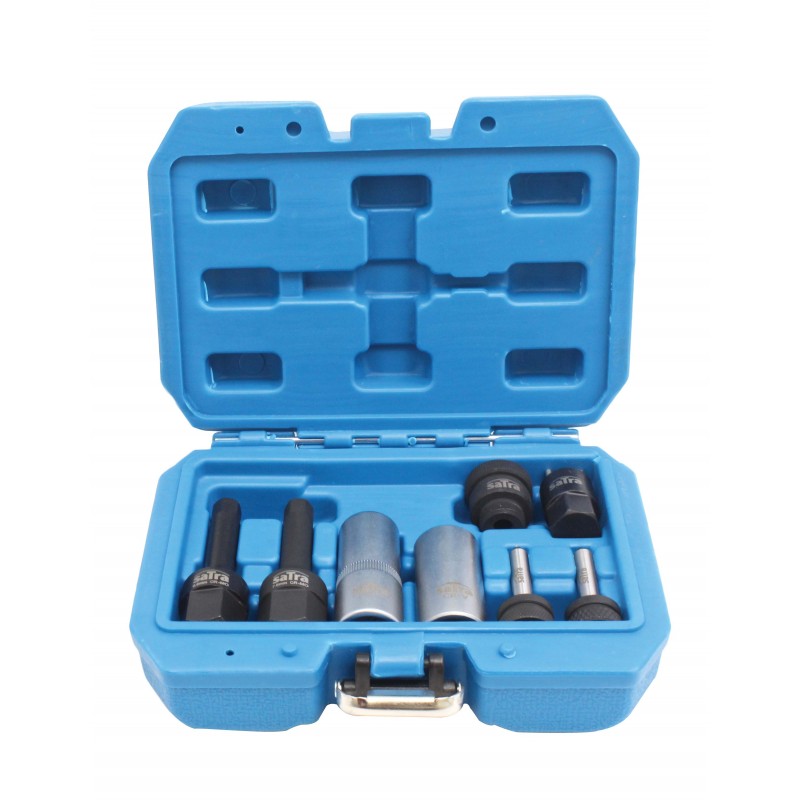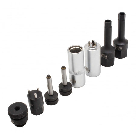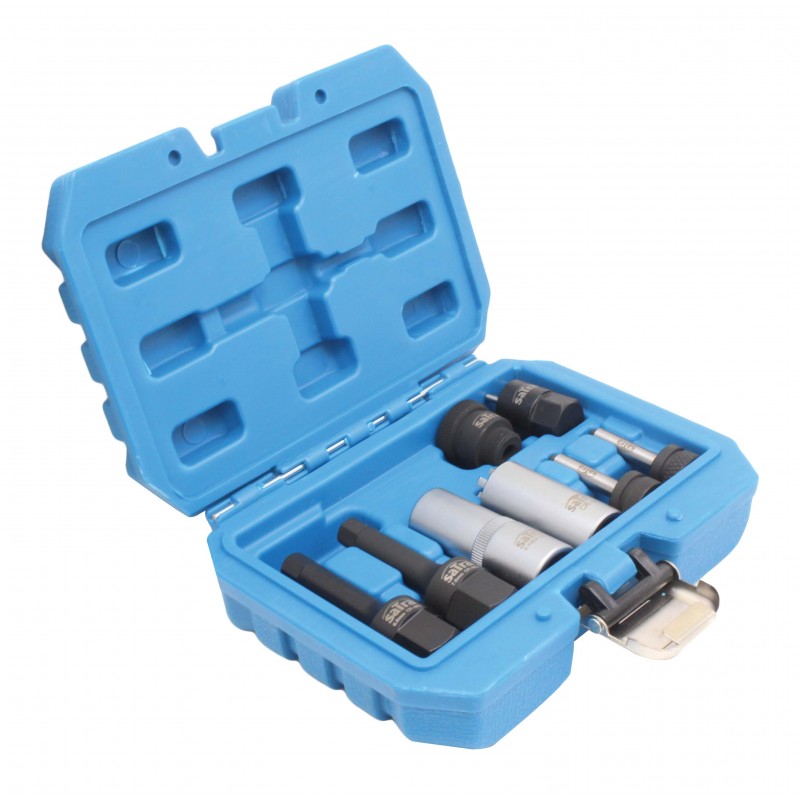 Dieses umfassende Werkzeugset ist eigens für die Wartung von Common-Rail-Injektoren von Bosch, Denso und Siemens konzipiert. Es stellt die notwendigen Hilfsmittel bereit, um die inneren Befestigungen der Injektoren zu demontieren und zu entnehmen. Zusätzlich beinhaltet es Spezialwerkzeuge zum Einschleifen von Injektor-Kugelhähnen sowie eine Kugelventilführung für Injektoren.