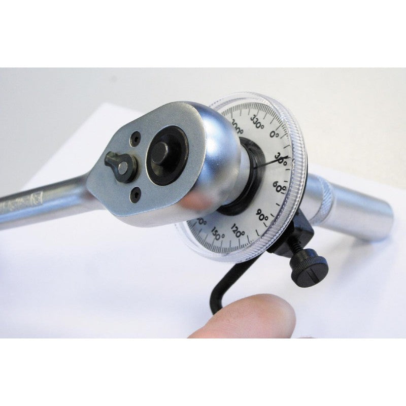 - Zur genauen Drehwinkelkontrolle des Drehmoments beim Festziehen von Schrauben in Motoren, Getrieben und anderen Baugruppen. Mit 1/2-Zoll-Aufnahme und 360-Grad-Skala.
