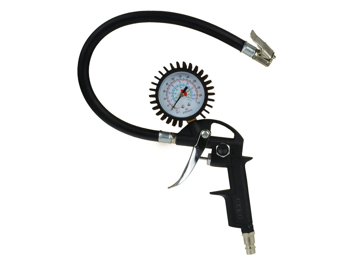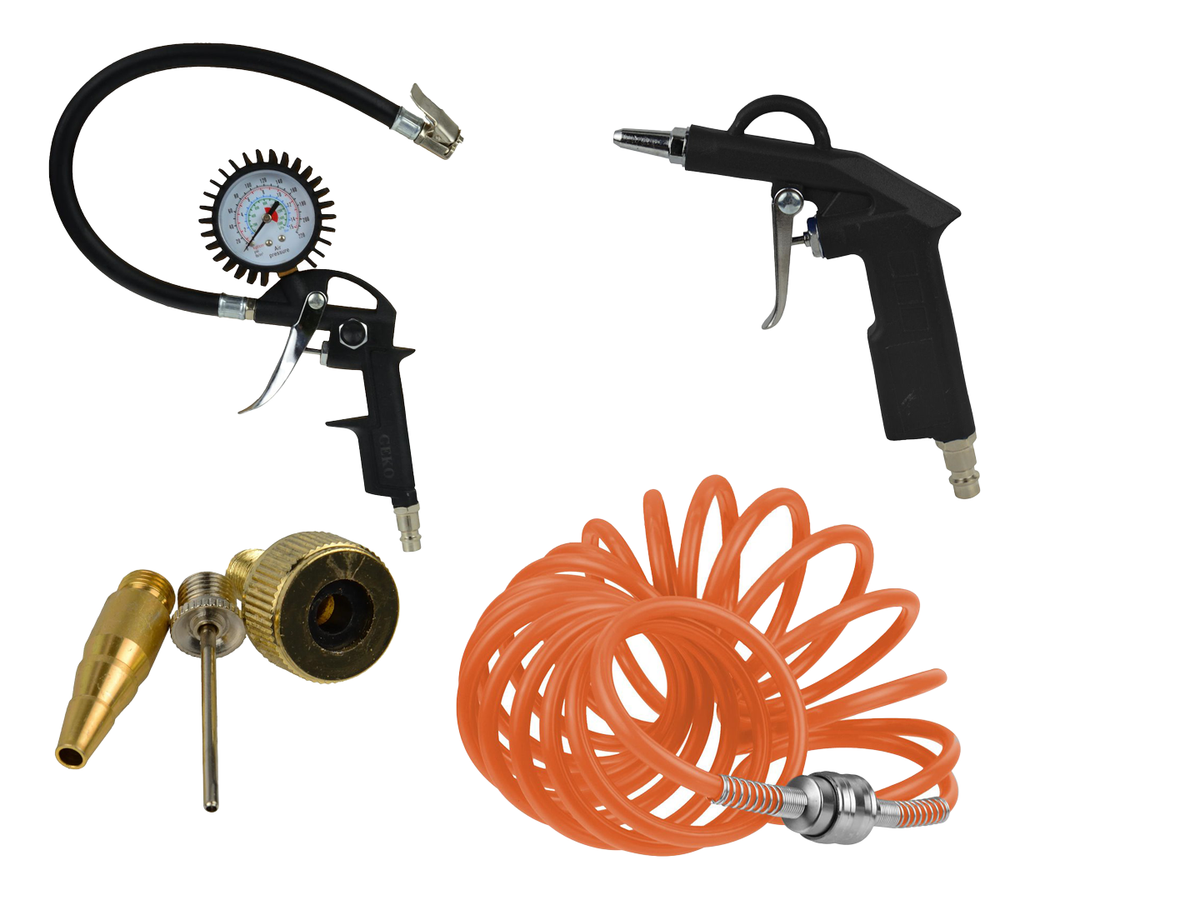 Der 6-teilige Druckluftwerkzeugsatz beinhaltet eine Druckluftpistole mit einem Betriebsdruck von bis zu 8 bar und einen Reifenfüllmesser mit Manometer, dessen Betriebsdruck bis zu 12 bar beträgt. Das Reifenfüllmesser-Manometer hat einen Druckbereich von 0-15 bar. Zusätzlich enthalten sind 3 verschiedene Aufsätze (siehe Bilder) und ein 5m langer PU Spiralschlauch. Ein hochwertiges und vielseitiges Werkzeugset für verschiedenste Anwendungen.