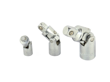 Dieses 3-teilige Kardangelenk Adapter Set enthält Gelenke für 1/4-, 3/8- und 1/2-Zoll-Ratschen & Steckschlüssel. Sie ermöglichen das problemlose Erreichen von schwer zugänglichen Stellen und sind aus langlebigem Chrom-Vanadium-Stahl gefertigt. Perfekt für eine Vielzahl von Anwendungen und Werkzeugen.