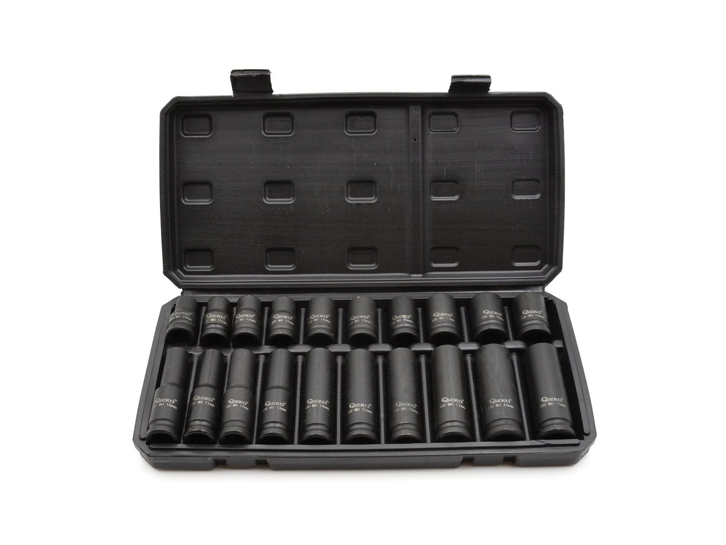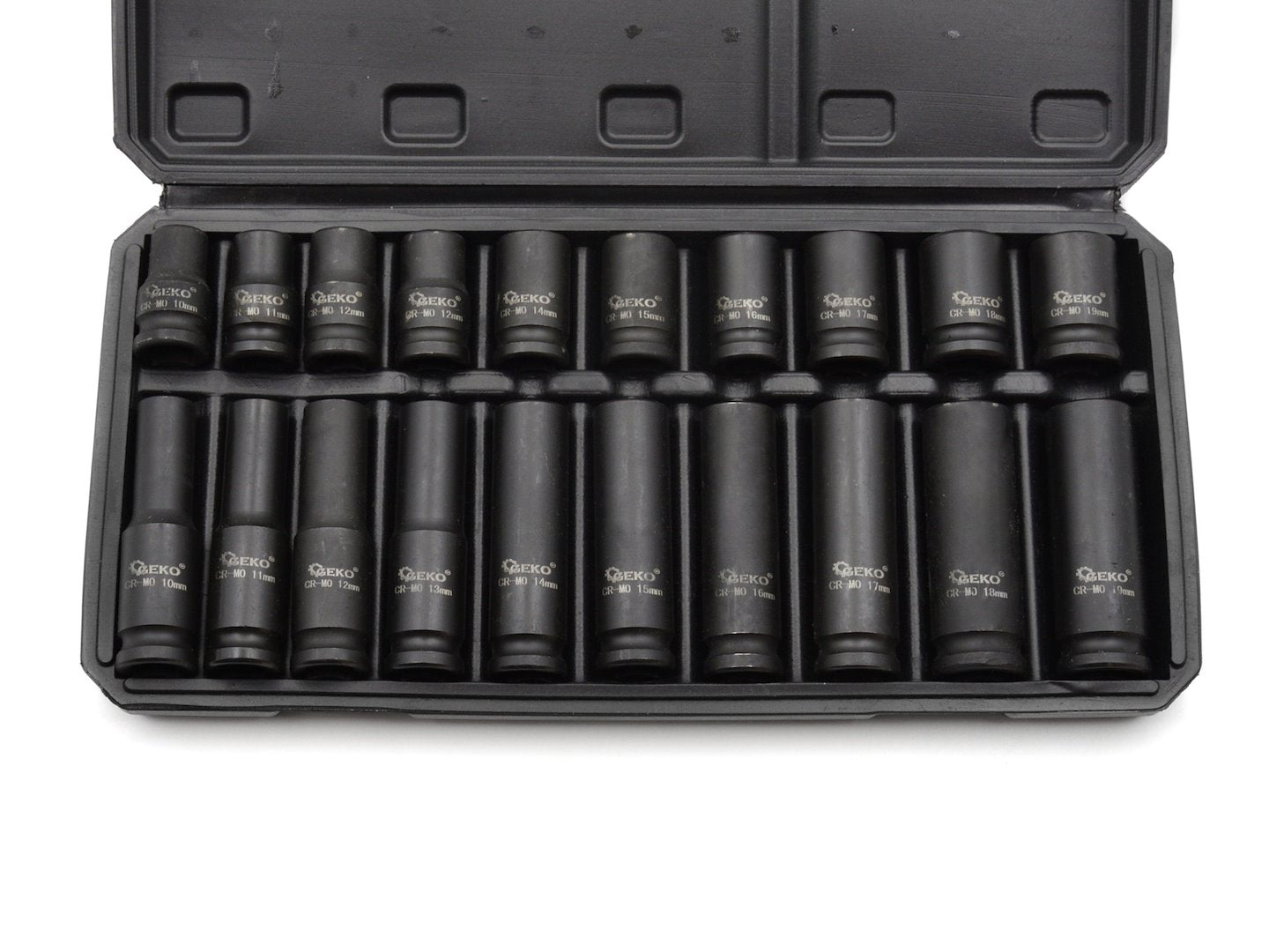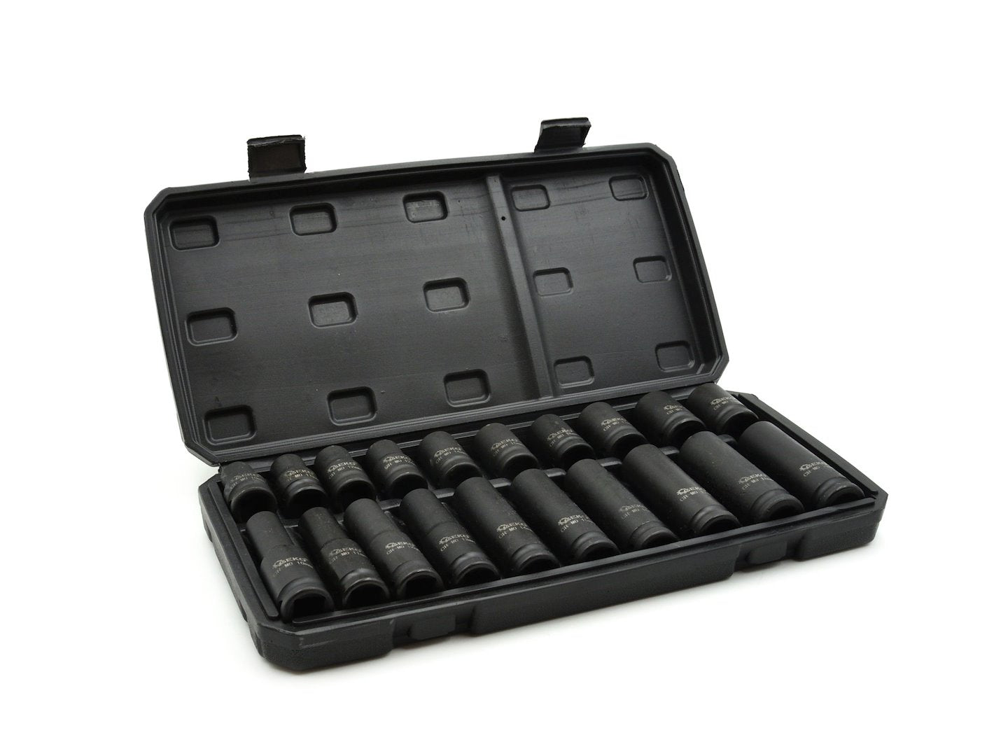 Satz Schlagnüsse aus Chrom-Molybdän, 1/2 Zoll Standard- und lange Nüsse. Metrische Stecknussgrößen reichen von 10 bis 19 mm. Hergestellt aus hochwertigem Chrom-Molybdän-Stahl. Schwarz oxidierte Oberfläche mit permanenten, lasergravierten Markierungen. Molybdän bietet eine höhere Zugfestigkeit und verringert die Gefahr einer Verformung. Kunststoff-Tragekoffer für einfachen Transport, einfache Lagerung und schnelle Organisation.