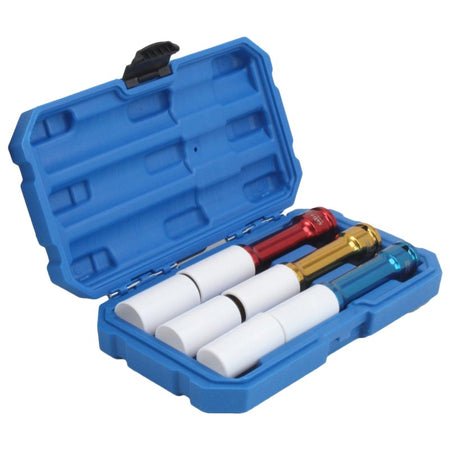 Dieses Set enthält drei austauschbare Schutzhülsen. Ihre schlanke, längliche Form ermöglicht den Einsatz bei einer Vielzahl von Aluminiumfelgen-Modellen und sorgt dafür, dass sie auch in engen Vertiefungen problemlos verwendet werden können. Die Farbkodierung der Nüsse garantiert eine schnelle und effiziente Auswahl der benötigten Größe.