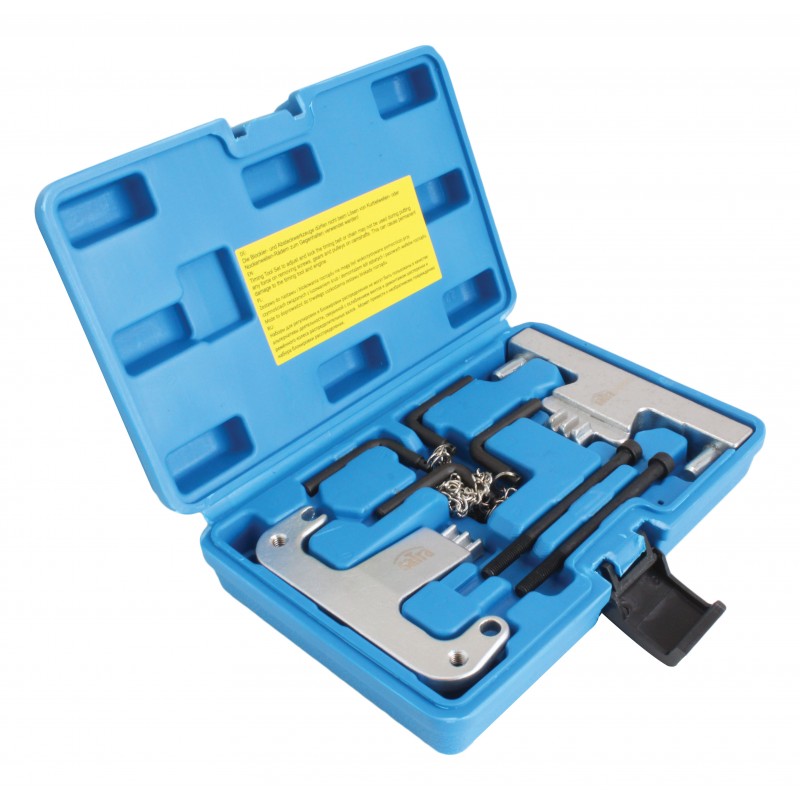 Dieser Werkzeugsatz enthält spezielle Werkzeuge zum präzisen Einstellen der Nockenwelle und zum sicheren Blockieren der Kurbelwelle (Schwungrad). Er ist für eine Vielzahl von Mercedes-Benz Modellen sowie für den Chrysler PT Cruiser und den Jeep Grand Cherokee geeignet.