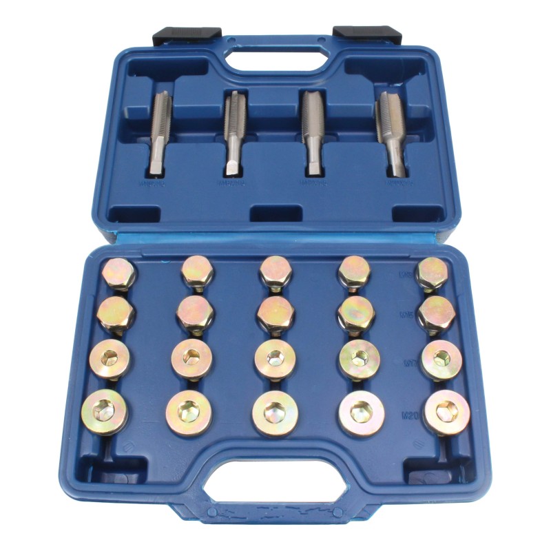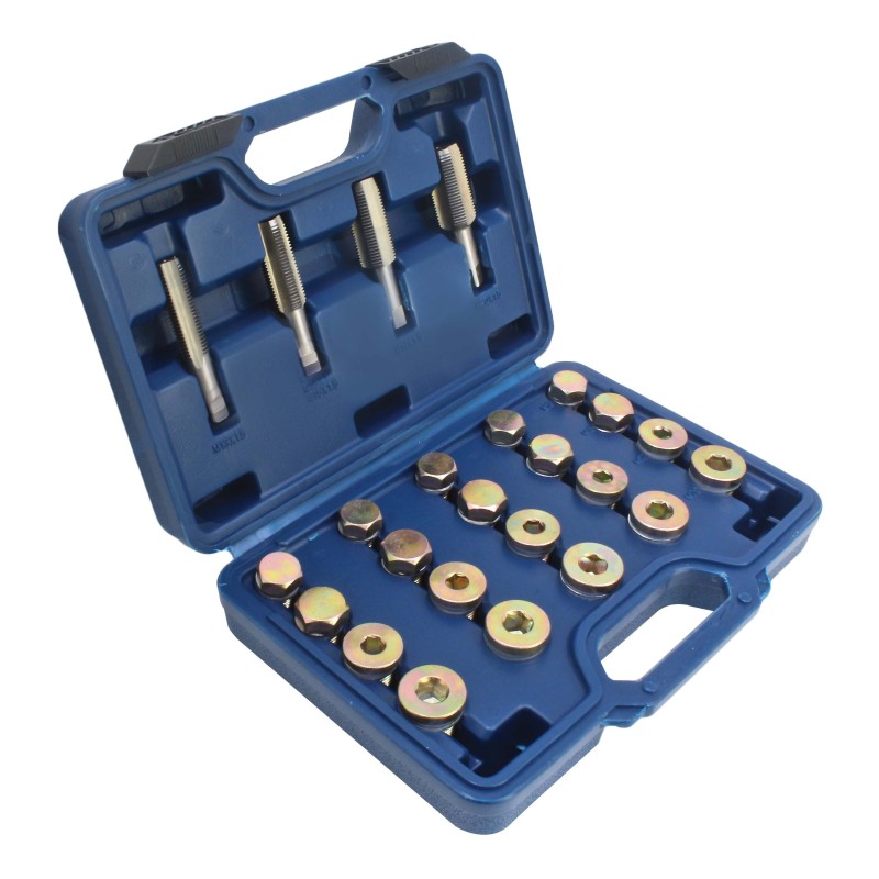 Dieses Werkzeugset erspart Ihnen den Austausch der Ölwanne. Beschädigte Gewinde werden mittels des Gewindebohrers entfernt und für die nächstgrößere Dimension vorbereitet.