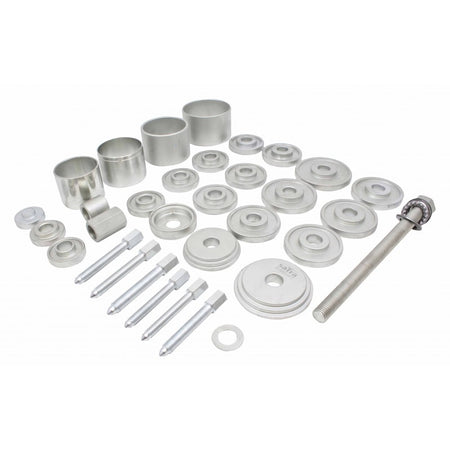 Dieses Werkzeug-Set ermöglicht die effiziente und schonende Demontage und Montage von Radnaben und Radlagern direkt am Fahrzeug. Durch die präzise Druckausübung am Lageraußenring wird das Lager optimal geschont. Das Set ist ideal für Achsrohre und Achsen mit Bundlagern.