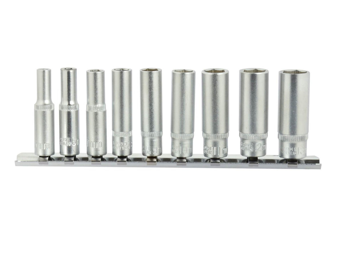 Satz langer 6-Eck-Steckschlüssel. Das Set umfasst 9 Steckschlüsseleinsätze in den Größen 5 – 13 mm mit 1/4"-Aufnahme. Das Ganze ist aus langlebigem Chrom-Vanadium-Stahl gefertigt.