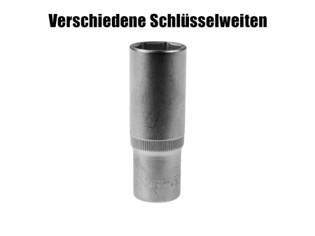 GEKO 1/2"-Steckschlüssel sind aus Chrom-Vanadium-legiertem Stahl gefertigt. Längere Lebensdauer der Steckschlüssel dank Wärmebehandlung im Produktionsprozess. Die längliche Form des Steckschlüssels ermöglicht das Festziehen und Lösen auch tief sitzender Schrauben.