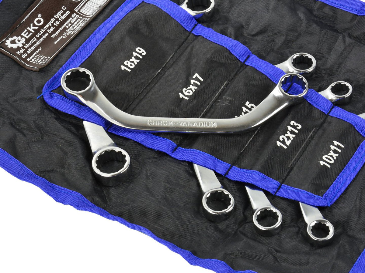 5-teiliger Typ-C Ringschlüsselsatz 10 - 19 mm. Diese Art von Schraubenschlüsseln wird an Stellen verwendet, wo Hindernisse den Zugang mit geraden Schraubenschlüsseln blockieren.